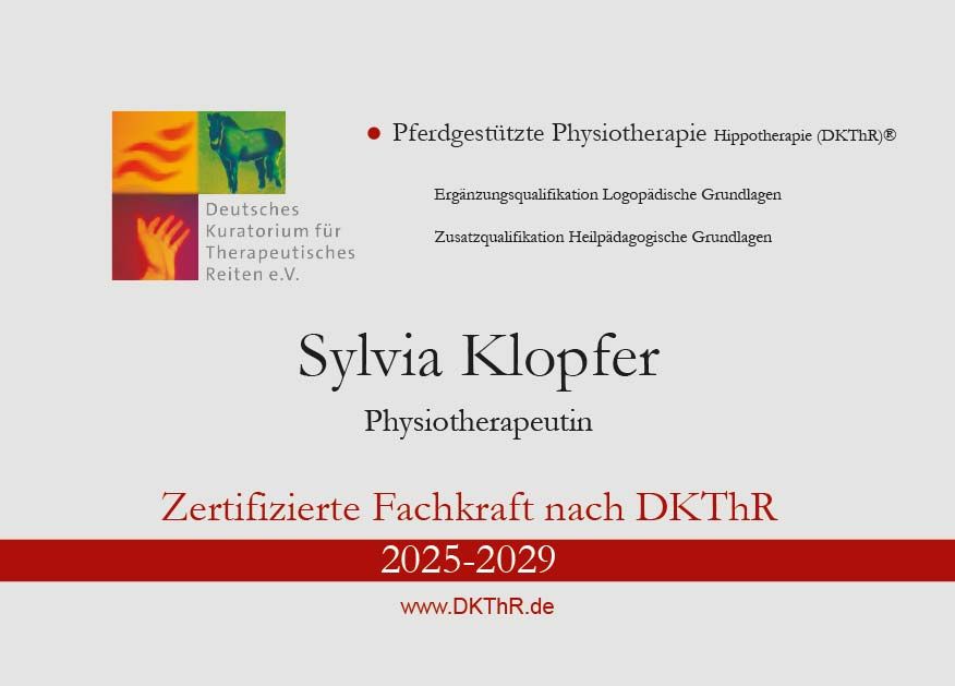 Bei der Hippotherapie (DKThR)® handelt es sich um eine physiotherapeutische Behandlung auf neurophysiologischer Grundlage auf dem Pferd. Die Hippotherapeuten benötigen eine spezielle Zusatzqualifikation. DKThR-Fachkräfte haben als ausgebildete Physiotherapeuten/vollapprobierte Ärzte eine solche berufliche Zusatzqualifikation beim DKThR in Kooperation mit Physio Deutschland | Deutscher Verband für Physiotherapie (ZVK) absolviert.